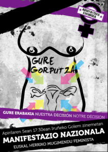 El próximo 5 de abril MANIFESTACIÓN NACIONAL en Iruña, saldrá a las 17:30 de los Cines Golem. GURE GORPUTZA, GURE ERABAKIA. NUESTRO CUERPO, NUESTRA DECISIÓN.