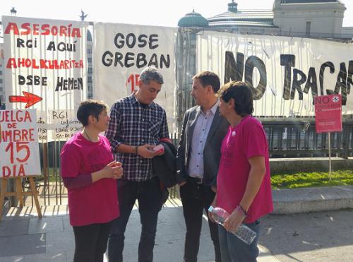En la mañana de ayer viernes Arnaldo Otegi ha manifestado su solidaridad con las personas que llevan más de 2 semanas en huelga de hambre contra los recortes en la RGI. Además, también han mostrado su apoyo el Diputado en el Congreso por EH Bildu Oskar Matute; y la portavoz del grupo municipal de EH Bildu en el Ayuntamiento de Bilbao Aitziber Ibaibarriaga.