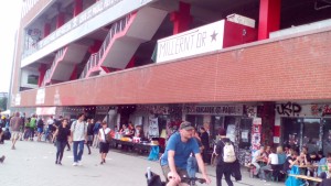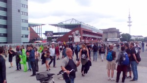 Ya en los alrededores del estadio de St.Pauli, abandonamos la demo para comer algo, son las 3 de la tarde y queda una hora para el final del recorrido. Puestos de comida turca rodean el escenario donde habrá conciertos y hablarán los representantes de movimientos internacionales.