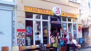 Decidimos caminar para allá y preguntar cómo están las companeras y, por el camino, vamos viendo la solidaridad de vecinas y locales del barrio con pancartas y carteles con lemas contra el G20 a cada cual más ingenioso: una herboristería que dice Me planto contra el G20, una tienda de comida turca: el G20 en St.Pauli es una irresponsabilidad, en otro local ofrecen electricidad y agua gratis,....