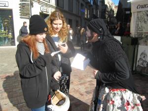 Para realizar esta denuncia y hacer más visible la acción, nos servimos de un pequeño teatrillo. Este teatrillo consistió en simular una cena de navidad, pero sin comida, sin nada de nada, con la olla más vacía que nunca. Utilizamos mesas y varias sillas e invitamos a esta cena precaria a todas las personas que pasaban por la plaza.