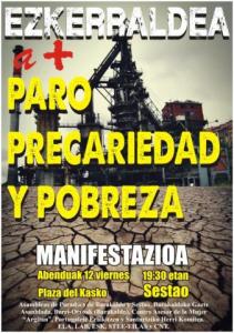 Por este motivo, diferentes asambleas de personas en paro, colectivos sociales y sindicales han decidido realizar una manifestación a nivel comarcal en Sestao para el viernes 12 de diciembre bajo el lema “Ezkerraldea va a más… más paro, más precariedad, más desahucios y más pobreza!” en la que se esperan que participen miles de vecinos y vecinas de la comarca.