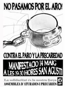 Volem fer visible en els carrers (una vegada més) la terrible situació per la què estem passant les persones aturades, les precàries i la classe treballadora en general. Per açò estem organitzant tot el necessari per a fer una manifestació el dia 14 de maig per a ensenyar-li a la societat la realitat a què ens han portat les polítiques de retallades i privatitzacions que ens estan asfixiant lentament. Motius per a aquesta i altres manifestacions hi ha molts però els que per a nosaltres vertebren el sentit de la manifestació del 14 de maig són els següents: