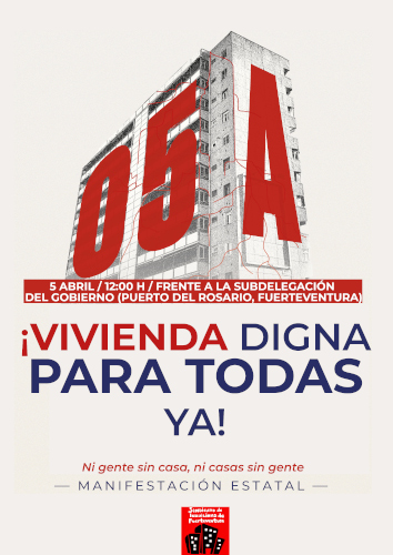 Sindicato de Inquilinas Fuerteventura.- La concentración tendrá lugar a las 12 h frente a la Delegación del Gobierno, en Puerto del Rosario, sumándose así Fuerteventura, Gran Canaria y Tenerife a la convocatoria estatal por una vivienda digna. Precarización, desahucios y dificultad de acceso a la vivienda son algunas de las problemáticas por las que salimos a las calles el próximo 5 de abril.